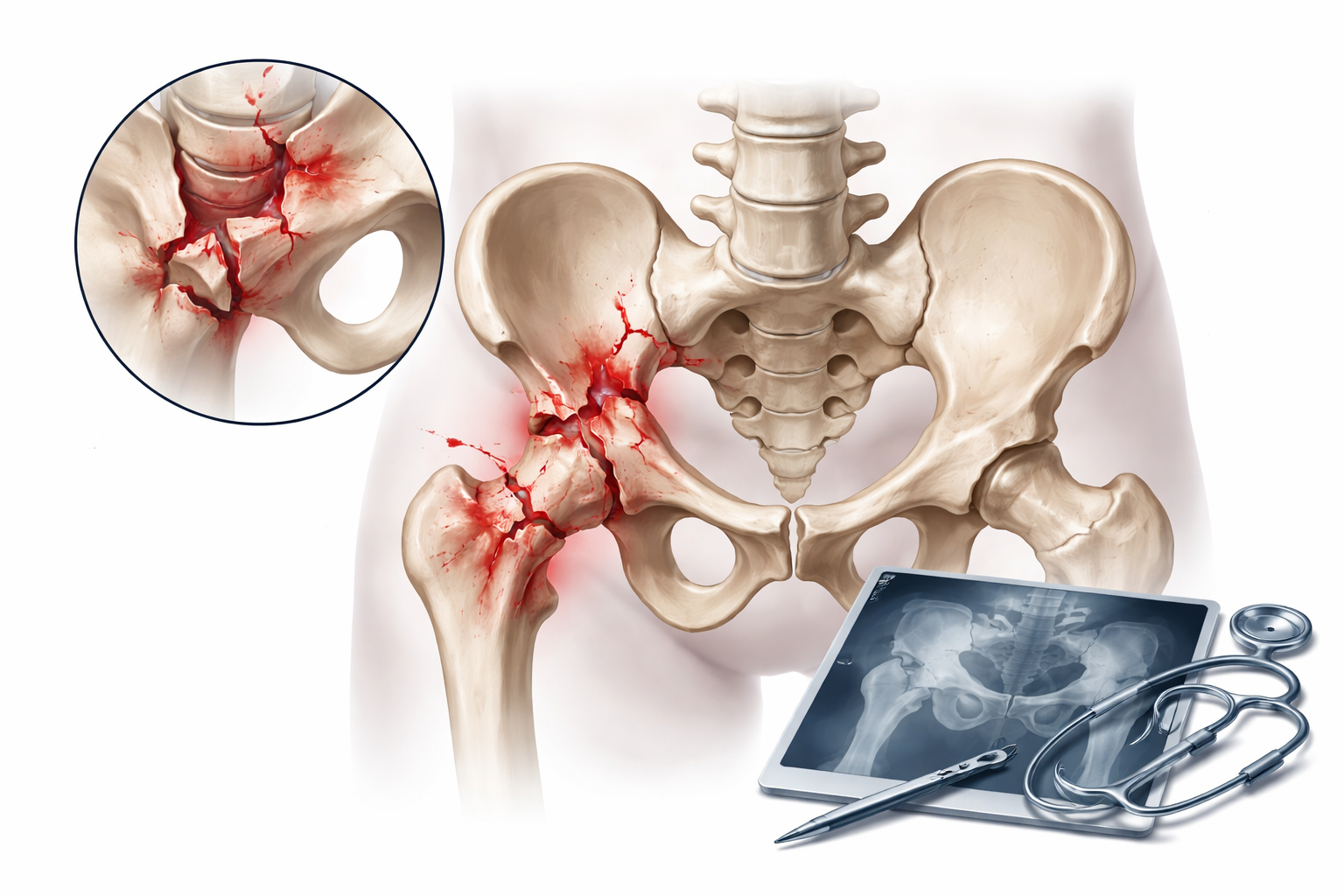 A pelvic fracture refers to a break in the pelvic bones, while an acetabular fracture affects the cup-shaped socket that holds the femoral head. Together, they disrupt the stability of the hip and can severely impair movement. This type of hip joint injury is usually seen in adults following major trauma but may also occur in elderly patients with weak bones.